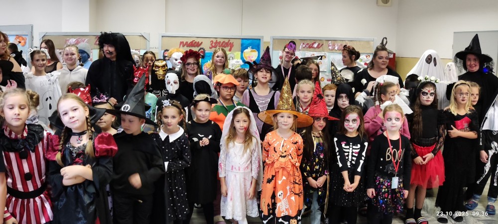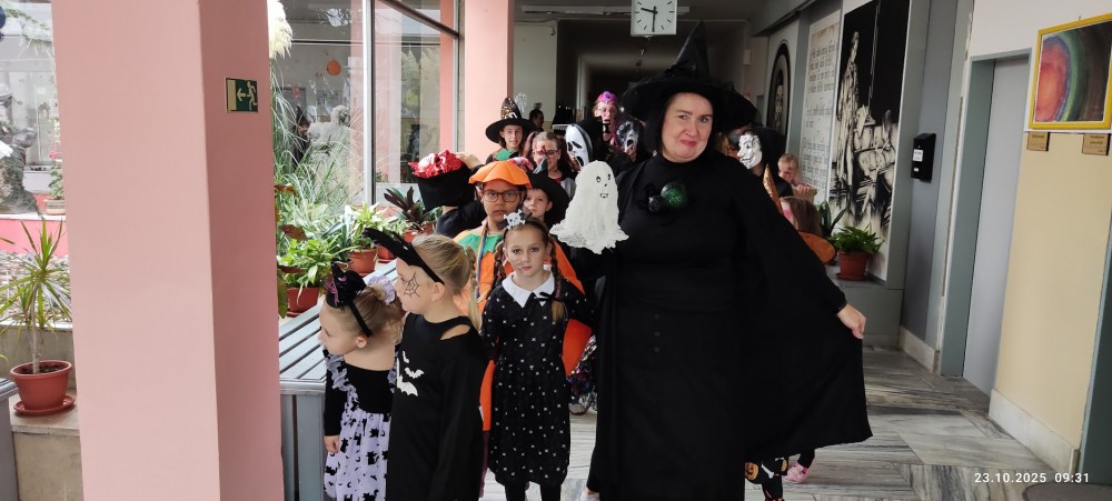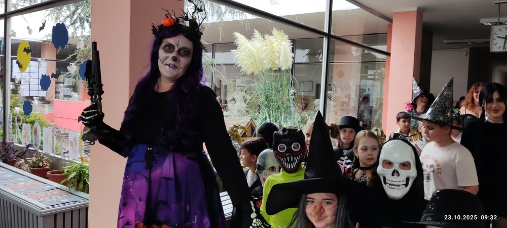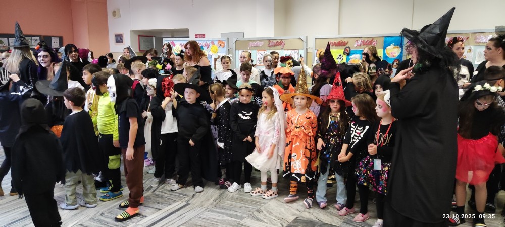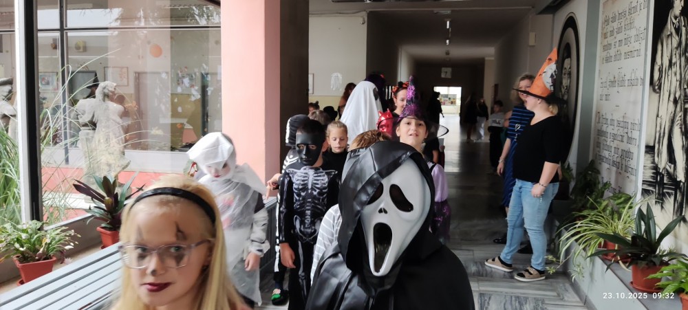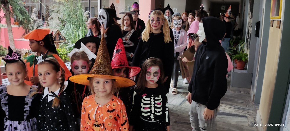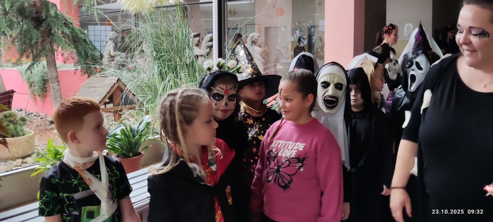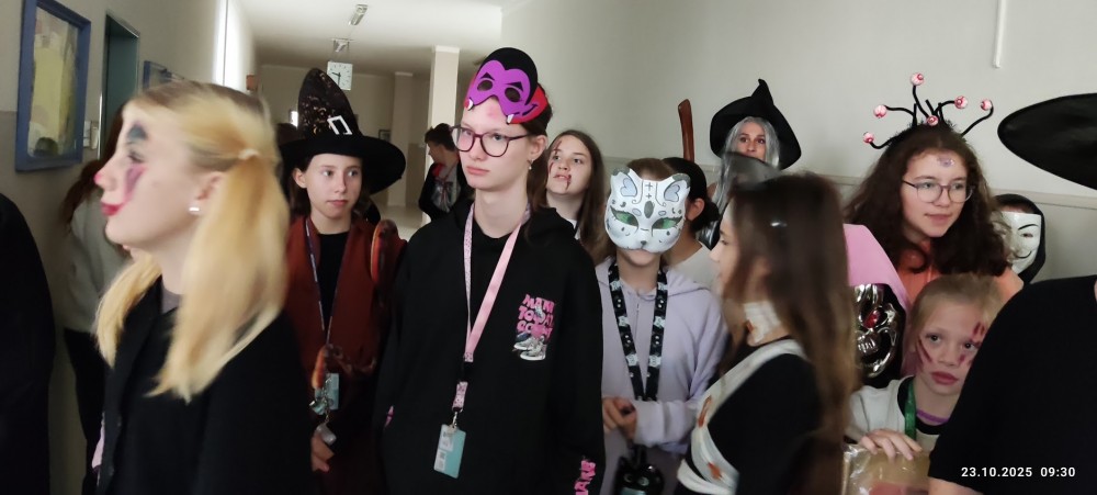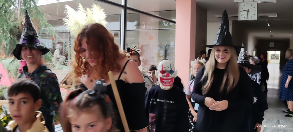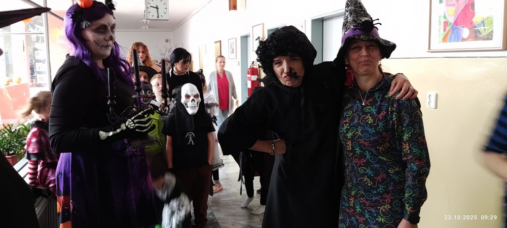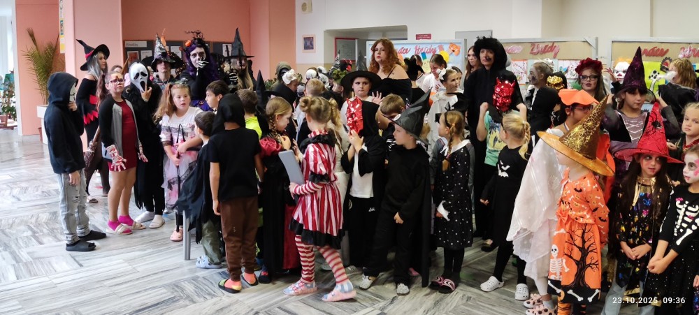 Ve čtvrtek dopoledne, o velké přestávce, se sešli žáci celé školy i všichni pedagogové a vedení školy, aby se v halloweenském průvodu předvedli se svými maskami. A zdalipak nás všechny poznáte??? Hádejte!!!