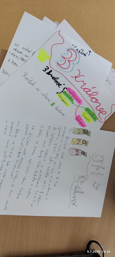 Hned první den po vánočních prázdninách jsme měli v klubu zajímavý a vzdělávací projekt o tradici tří králů. Pracovali jsme i s počítači a s AI, učili jsme se zpracovávat texty a zdokonalovali jsme se v kreslení postav. Tři nejlepší pracovní listy, které jsme vytvořili, byly oceněny.